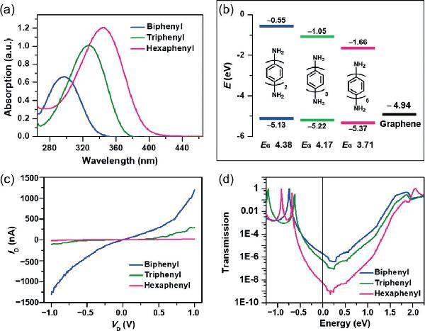 c) 以胺基为键合基团的联苯、三苯基和六苯基分子的结构;