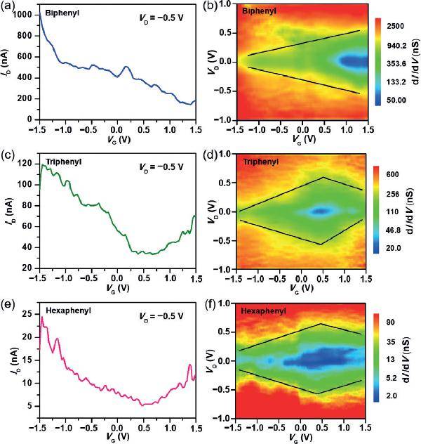 G = 0V下测试的联苯/三苯基/六苯基重联分子结的I-V曲线;