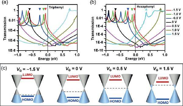 c) 在不同栅极电压下三苯基和六苯基单分子晶体管中分子轨道相对于石墨烯费米能级匹配的能级图。