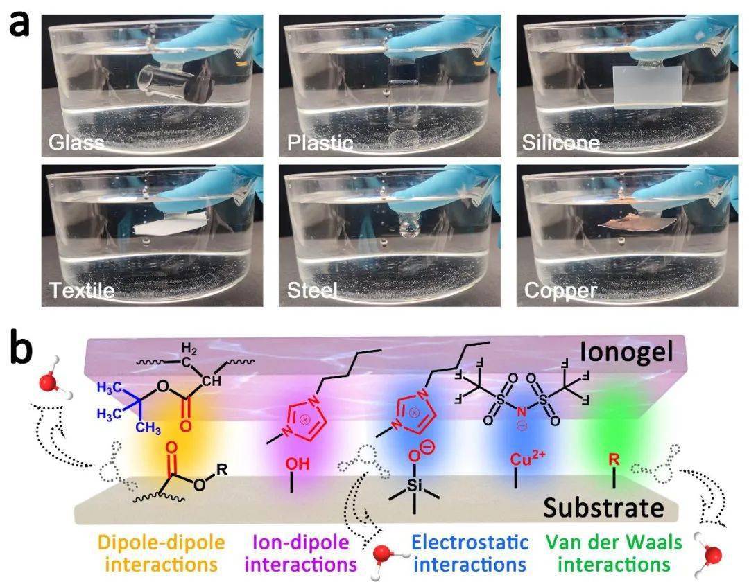 图 a)全疏水离子液体凝胶在水下的粘附性;b)全疏水离子液体凝胶的水下粘附机制