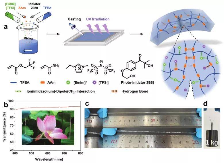 选择含氟单体2,2,2-三氟乙基丙烯酸酯(TFEA)作为聚合物基体,选择丙烯酰胺(AAm)作为共聚单体,引入氢键作用来调节离子凝胶的力学性能。选择1-乙基-3-甲基咪唑双(三氟甲烷磺酰)亚胺([EMIM][TFSI])作为电解质盐。 离子凝胶是通过在[EMIM][TFSI]中进行TFEA和AAm的简便地一锅光引发共聚而制备的,在定制的硅胶模具中不添加任何化学交联剂(图1a)。离子溶剂[EMIM][TFSI]可以通过离子偶极子相互作用与聚合物基体上的CF3基团相互作用,这有助于增强IL与聚合物基体的相容性,提高离子凝胶的稳定性。