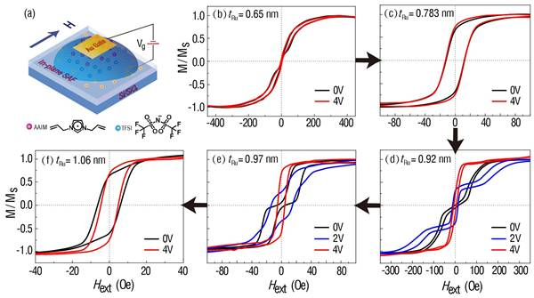 ( b-i) 不同Ru厚度下电压对RKKY效应的调控作用;外加磁场沿着磁易轴方向,即面外方向;结果显示了在离子液体调控过程当中人工反铁磁具有丰富的磁学行为,可以实现单-双-三回线之间的转换,表明人工反铁磁可以实现铁磁-反铁磁耦合之间的转变;除了Ru厚度在改变以外,其余层的厚度与图1一致。
