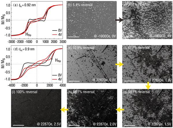 (e-i) 是电压变化所对应的磁畴变化图;磁畴翻转比例的确定:首先计算亮区 ( b , c )和暗区 ( e-i )所占比值,然后用磁化饱和时的值进行归一化。